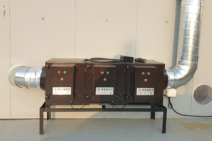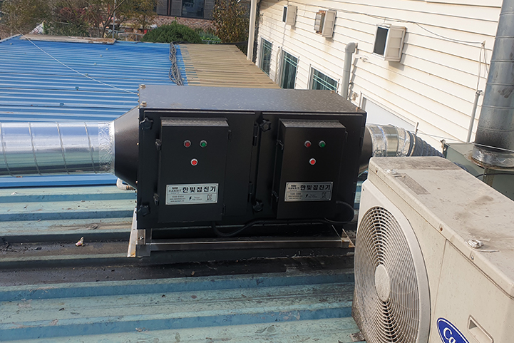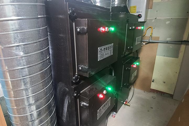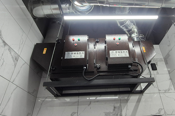 요식업 전기집진기는 정전기의 원리로 공기로부터 유증기와 연기를 분리, 말끔히 제거합니다.