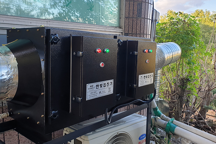 요식업 전기집진기는 정전기의 원리로 공기로부터 유증기와 연기를 분리, 말끔히 제거합니다.